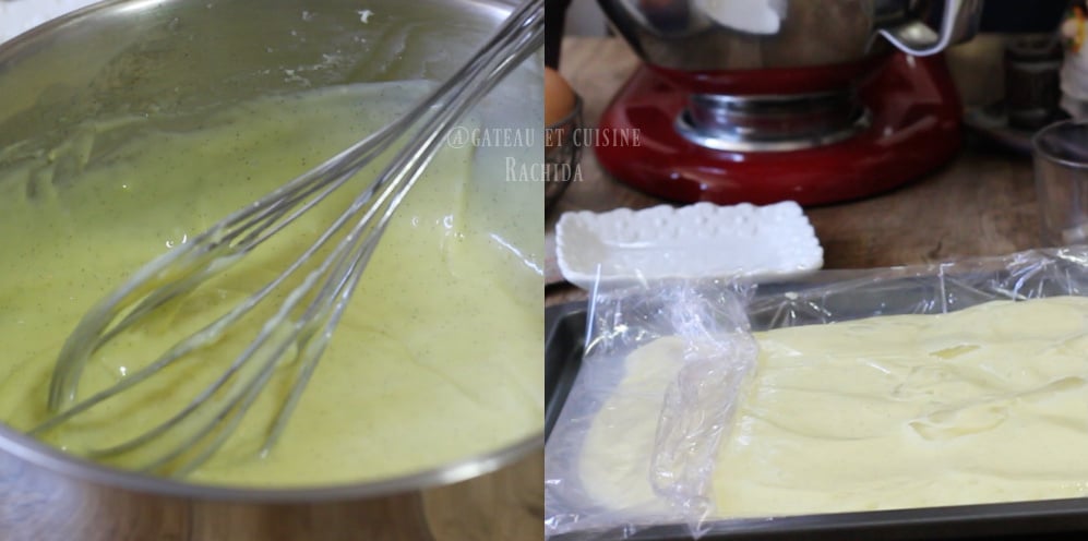 Verser la crème dans un plat large couvert d’un film plastique en l’étalant en fine couche pour accélérer son refroidissement. La filmer au contact pour éviter qu’elle ne croûte à la surface.