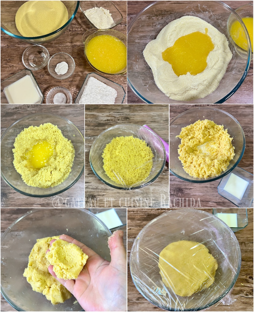 - Attention : Ne travaillez pas trop la pâte pour avoir une texture sablée après cuisson. Ajoutez-le lait en très petite quantité à la fois pour ne pas vous retrouver avec une pâte trop molle. La quantité de lait dépendra de l'absorption de la semoule.