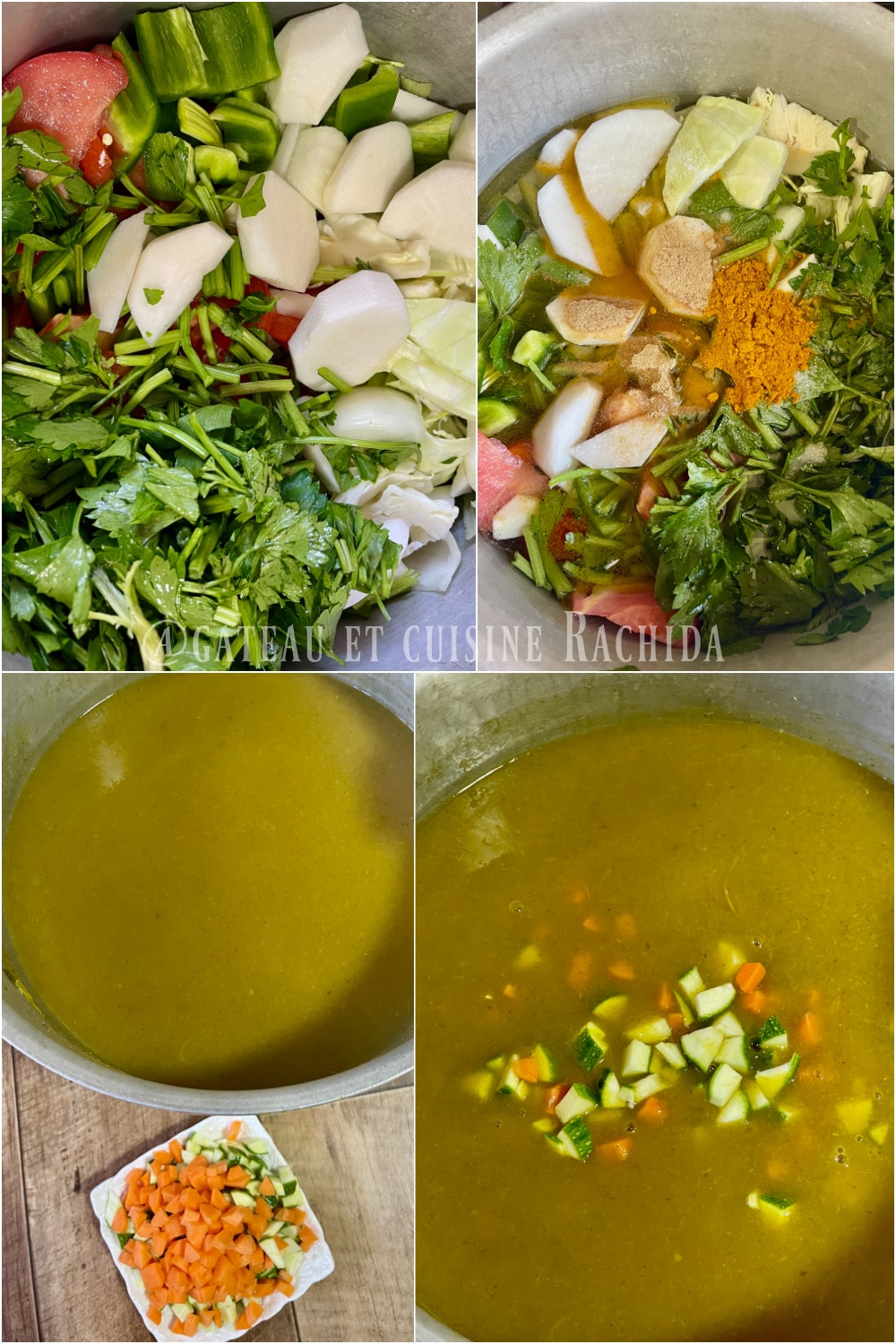 - Couper les tomates sans leur retirer la peau , le chou, le céleri et le poivron et mettre le tout dans une cocotte minutes.